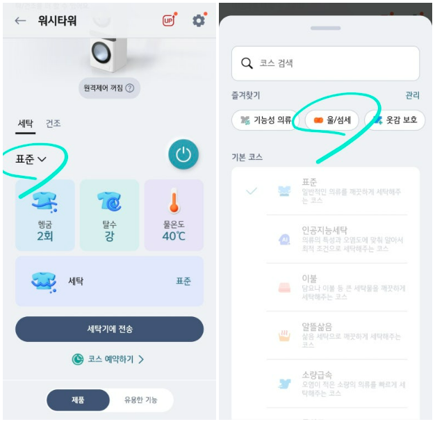 "LG ThinQ"앱을 통해서 "울코스"로 설정을 해 놓고 나서