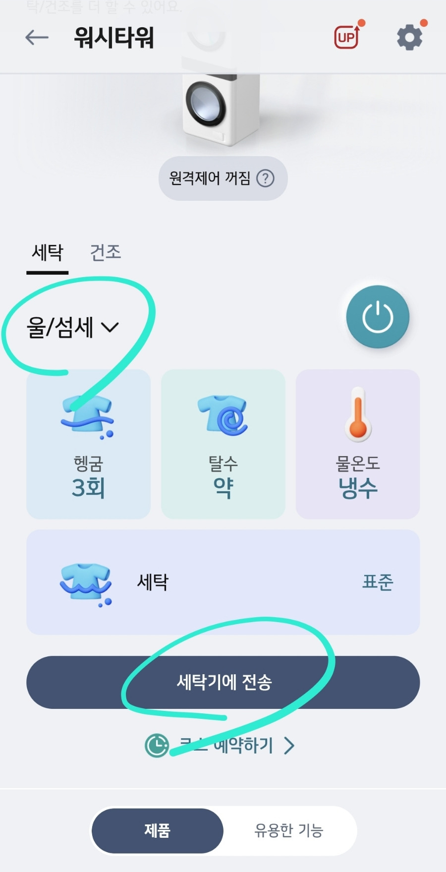 "울/섬세"설정을 확인하시고 세탁기에 전송을 누르세요.