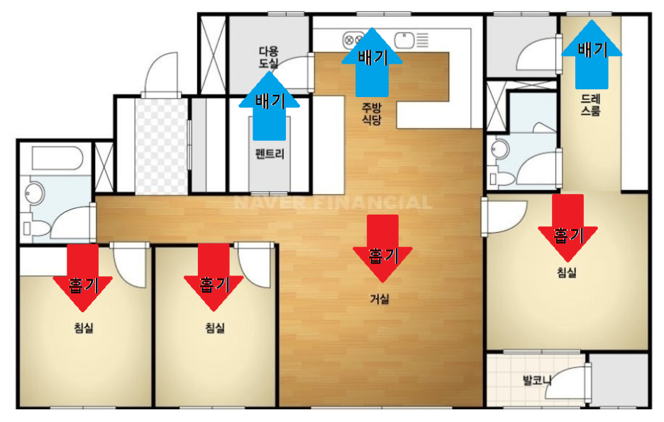- 급기 그릴: 거실/침실 → 천장형 사각 or 원형 평면형