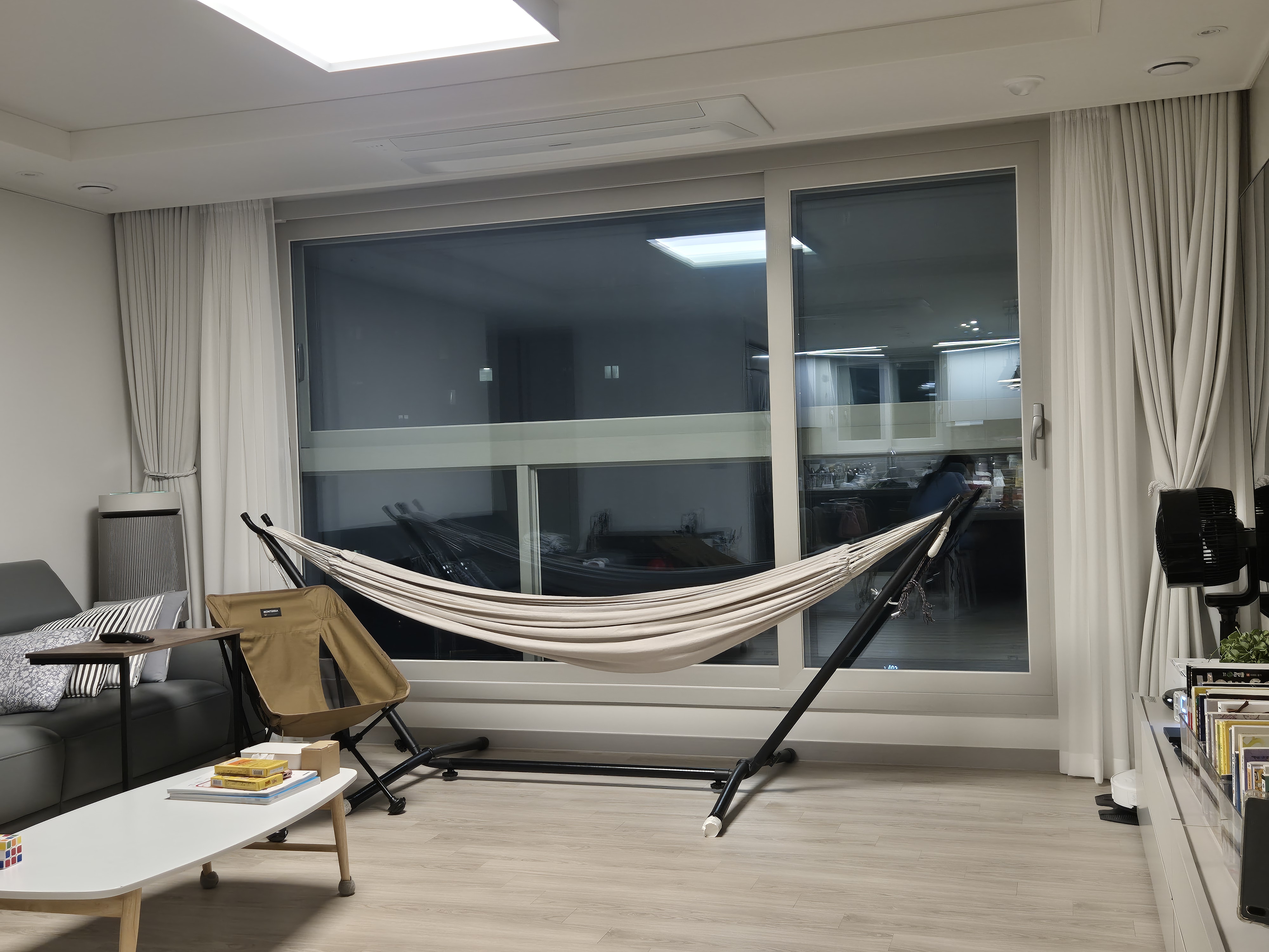 거실에 해먹을 설치하면 책보기도 좋고 TV 볼 때에도 좋아요.